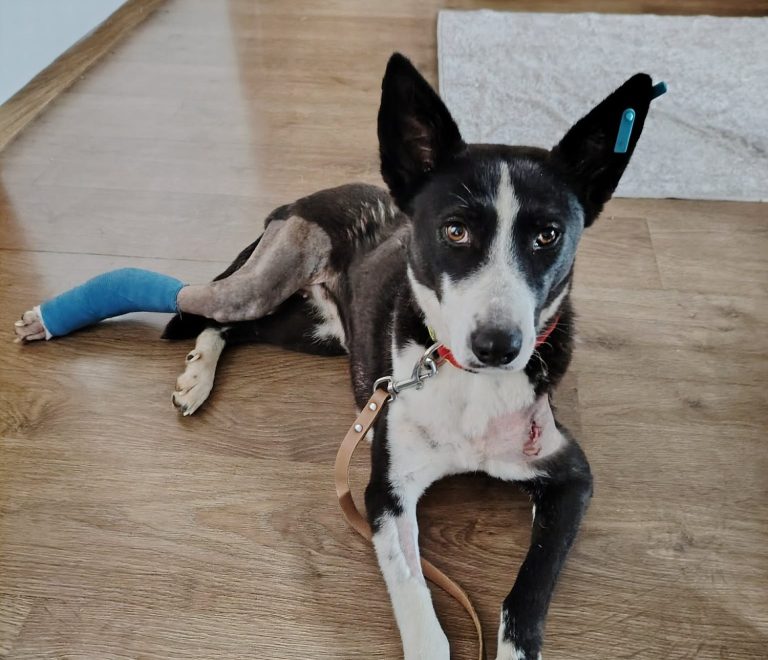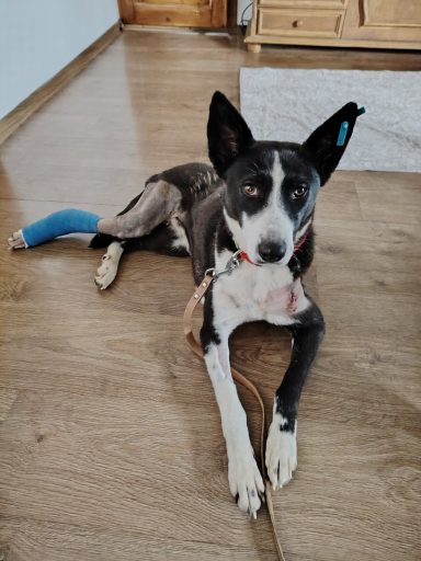 Die etwa 1 bis 1,5 Jahre alte Hündin wurde ganz allein an einer Schule gefunden – schwer krank, verletzt und auf sich gestellt. Sie litt unter einer massiven Gebärmutterentzündung und hatte zusätzlich ein gebrochenes Bein.